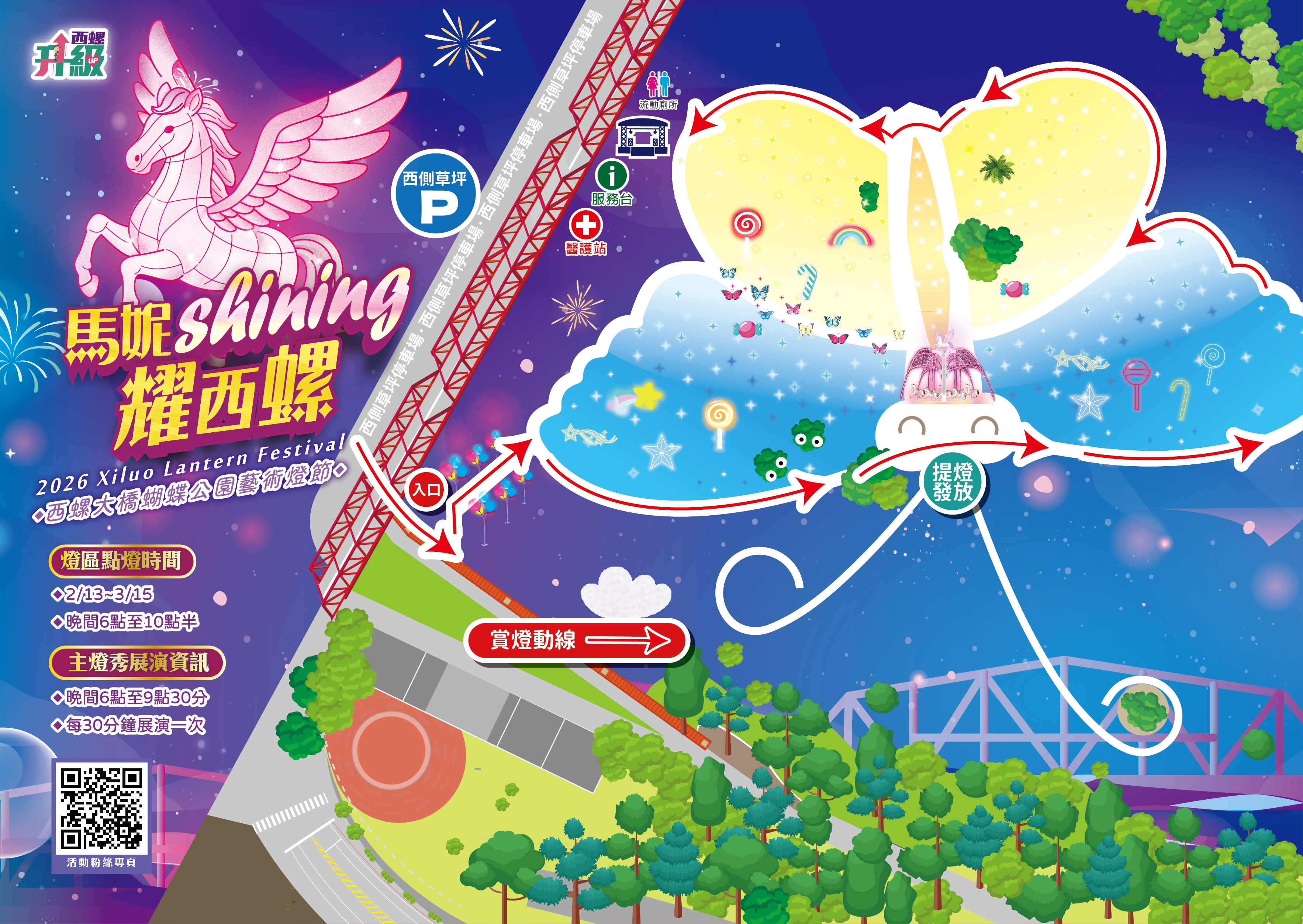 2026西螺大橋蝴蝶公園藝術燈節「馬妮shining耀西螺」,融合生肖文化、遊樂園童趣與光影藝術,打造一場跨世代共感的燈節盛典,主燈以翱翔飛馬為造型,高約9米的大型主燈隨音樂變換流光溢彩的燈光特效,下方環繞旋轉木馬燈組,勾勒出童話般的場景,新春期間歡迎大家來西螺走春,白天遊老街、吃美食,晚上來蝴蝶公園走走,帶領大家穿越想像的邊界,打造夢幻的光影嘉年華!