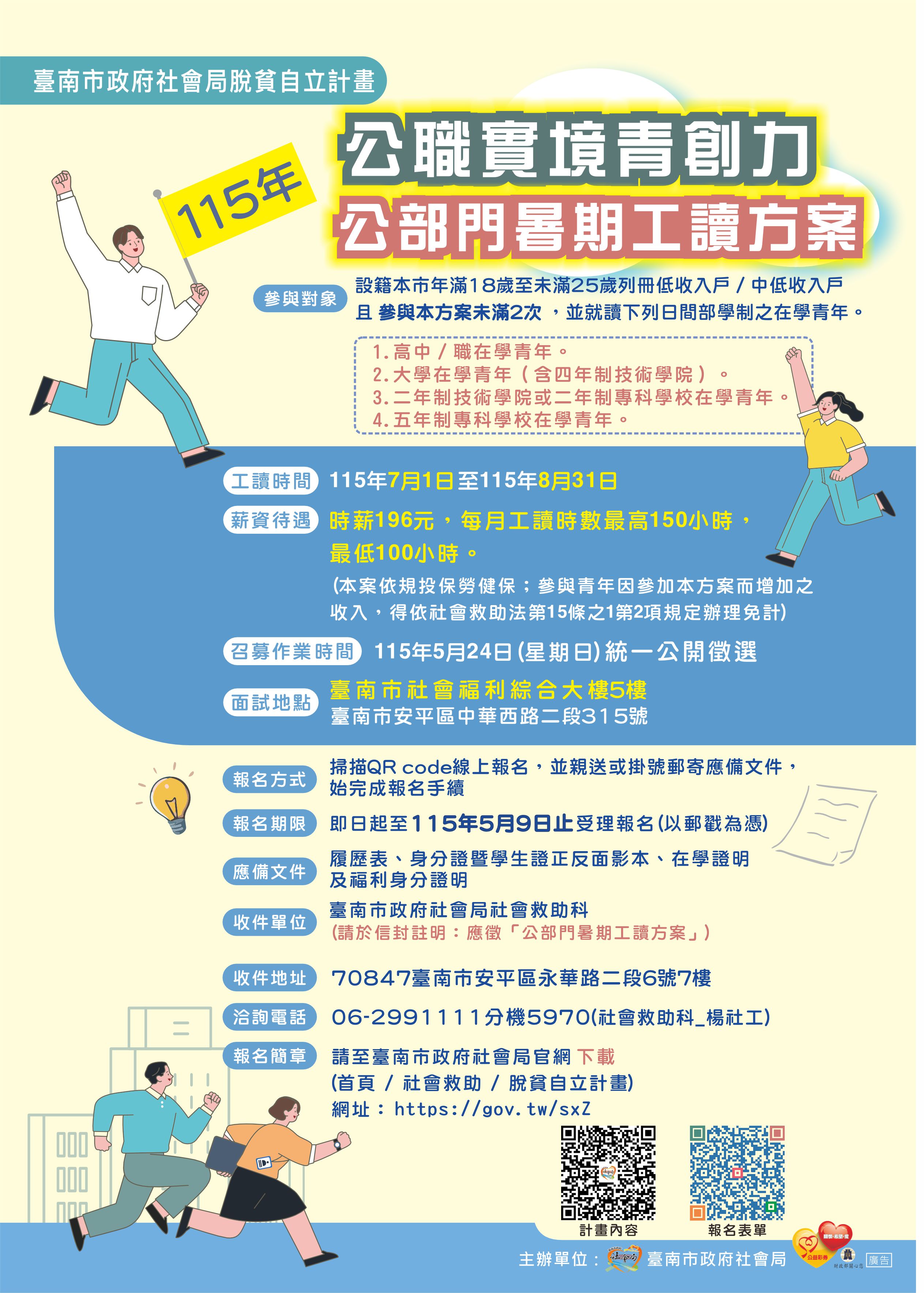 115年度脫貧自立計畫-教育培力方案、職涯GPS優先保留給年滿16歲,且未超過25歲之低收、中收入戶學生資格 公部門暑期工讀計畫報名資格須年滿18歲。