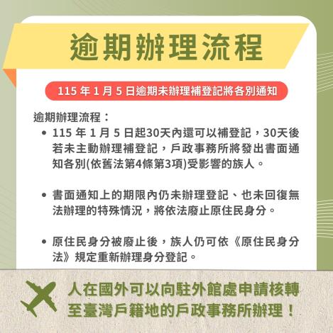 115 年 1 月 5 日起30天內還可以補登記,30天後若未主動辦理補登記,戶政事務所將發出書面通知各別(依舊法第4條第3項)受影響的族人。書面通知上的期限內仍未辦理登記、也未回復無法辦理的特殊情況,將依法廢止原住民身分。原住民身分被廢止後,族人仍可依《原住民身分法》規定重新辦理身分登記。逾期辦理流程115 年 1 月 5 日逾期未辦理補登記將各別通知。