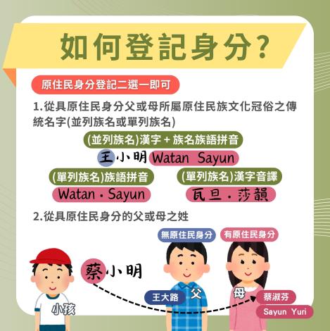 依《原住民身分法》第5條第1項第4款規定,部分族人循110年1月27日修正施行前第4條第3項規定取得原住民身分者,應於115年1月5日前,取用或以原住民族文字並列原住民父或母所屬原住民族之傳統名字,或從原住民父或母之姓,否則其原住民身分將依法喪失!!!