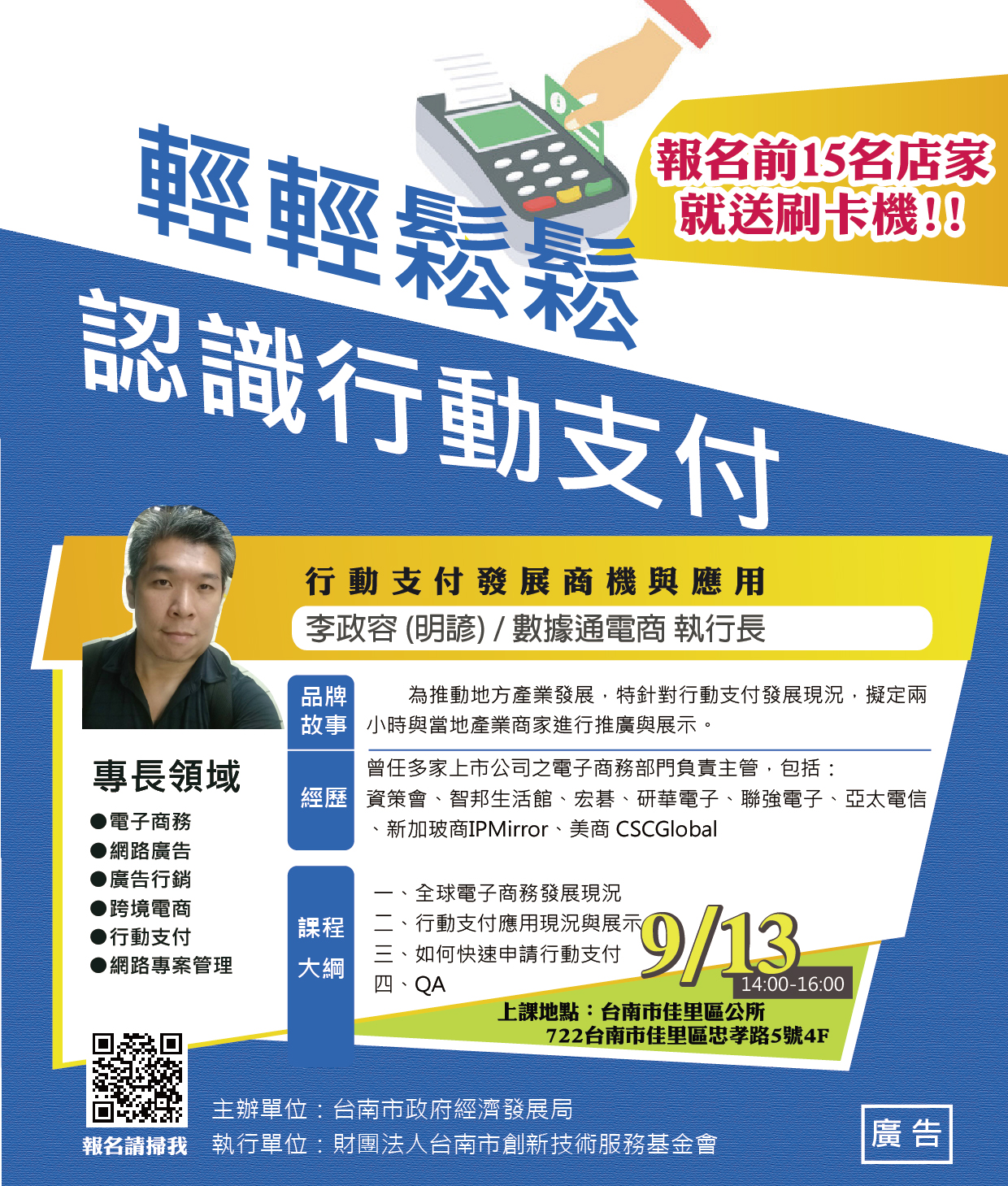 行動支付課程來囉!(當天贈送神秘小禮物) 這是溪北商圈的行動支付課程共有佳里及新營兩個場次🌟歡迎大家一起來上課🌟學習現代化的支付方式讓我們商圈越來越好👍👍👍 好康來了~報名前15名會送行動刷卡機(夜市也能刷卡!)快點點開我們的海報看仔細呦!🎉🎉報名網址https://goo.gl/forms/t30kUrqxVrwkWHBt1 https://goo.gl/forms/t30kUrqxVrwkWHBt1 各位好~佳里區的行動支付課程!歡迎大家一起來上課 學習現代化的支付方式,讓我們商圈越來越好! 日期:2018/09/13 下午2點~4點地點:臺南市佳里區公所4F禮堂