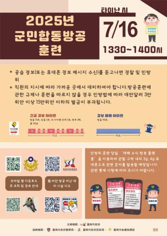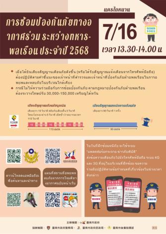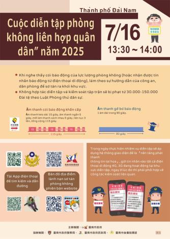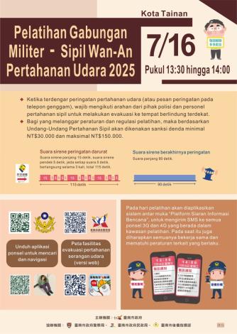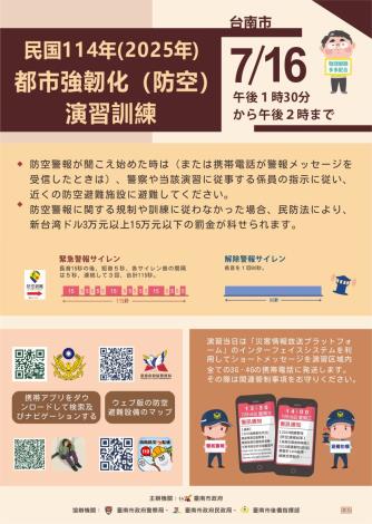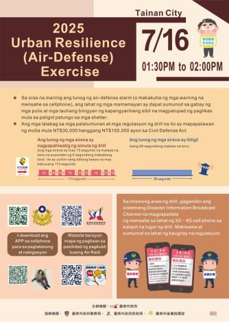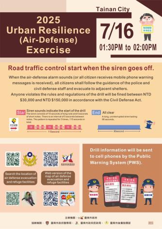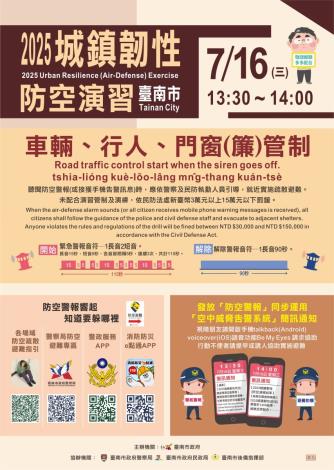 2025城鎮韌性(防空)演習南部地區(臺南市、高雄市、屏東縣)訂於114年7月16日(星期三)13時30分至14時舉行。演習期間實施車輛、行人、門窗(簾)管制等事項。聽聞防空警報(或接獲手機告警訊息)時,應依警察及民防執勤人員引導,就近實施疏散避難。未配合演習管制及演練,依民防法處新臺幣3萬元以上15萬元以下罰緩。請參閱臺南市政府警察局印製之8國語言宣導單。